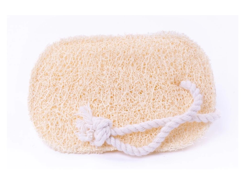 Masážní a mycí pomůcka, oválná lufová žínka s provázkem, 13 x 9 cm.